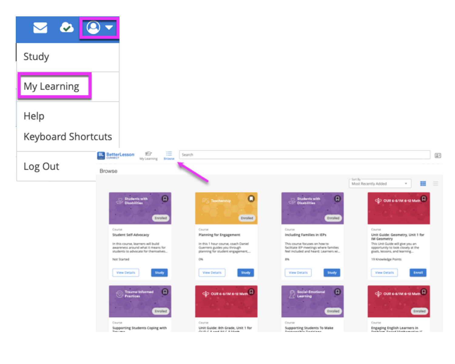My Learning: You can find other courses by accessing your My Learning hub at any time. To do so, click on your avatar icon in the upper right corner and then choose My Learning. This will take you back to the main page where all the courses are listed. You may Browse or select another course to get started.