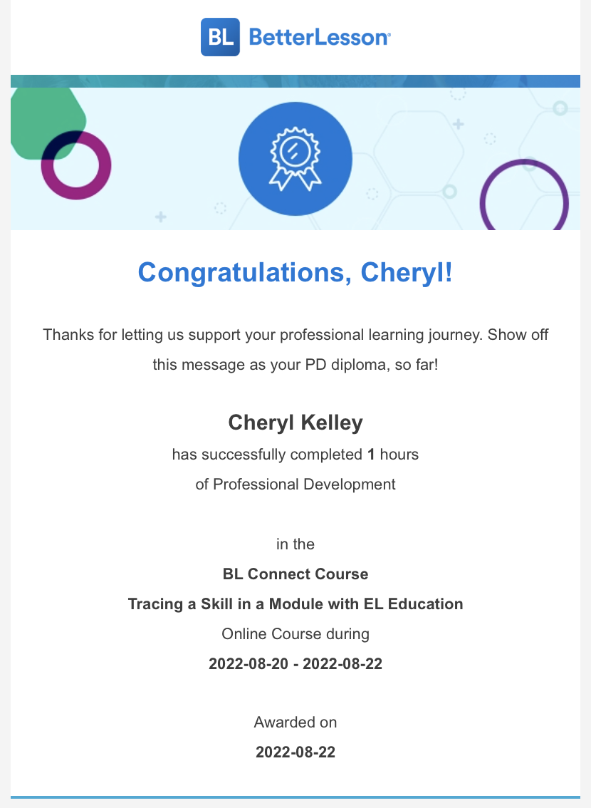 You should be receiving an automated email from certificates@betterlesson.com that shows your name, course title, date, and 1-hour of completion. This will be sent to the school email that is associated with your BetterLesson account.