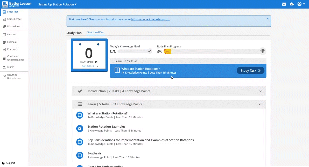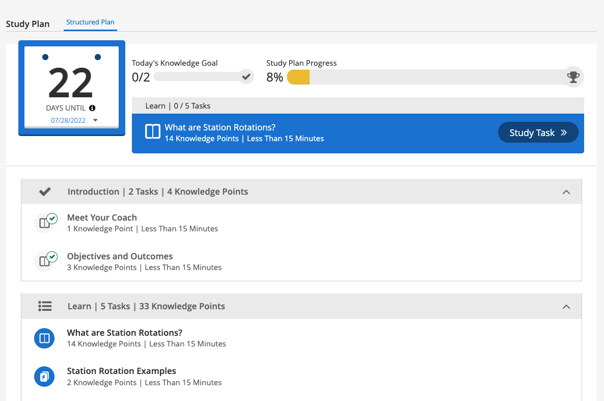 Study Plan - This is the first screen you see once you are ready to start a course. The number of days countdown and calendar are provided to help you plan your study timeline. You may adjust the deadline by clicking on the arrow next to the date. A study plan allows you to see an outline of the course from beginning to end. It also shows you which tasks have been completed (green check marks) and which have not.