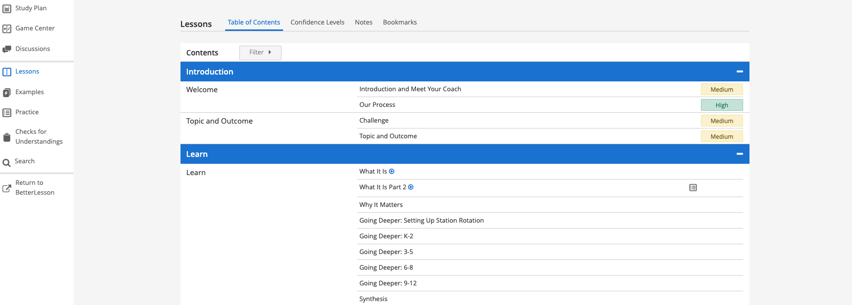 2. Lessons - Located on the left-side navigational panel, Lessons give you a more in-depth look into the topics that are nestled within a course. This allows you to navigate to a lesson that you’re interested in quickly while giving you an option to see what you’ve already completed at a high-level view.