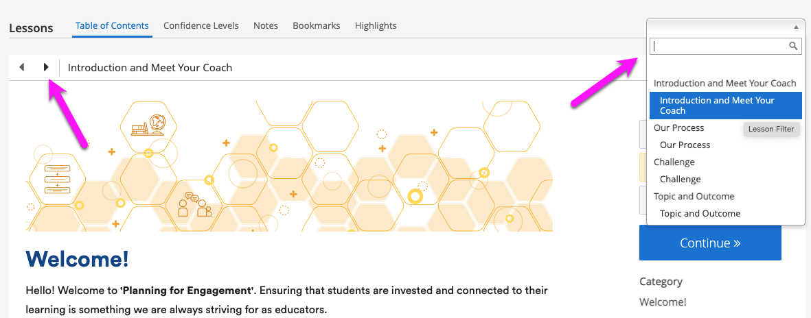 4. Lesson filter - This drop-down filter allows you to select and jump straight into a lesson without having to scroll through the different sections.